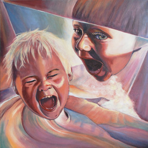 2016Olieverf portret van twee vrolijke gillende kinderen